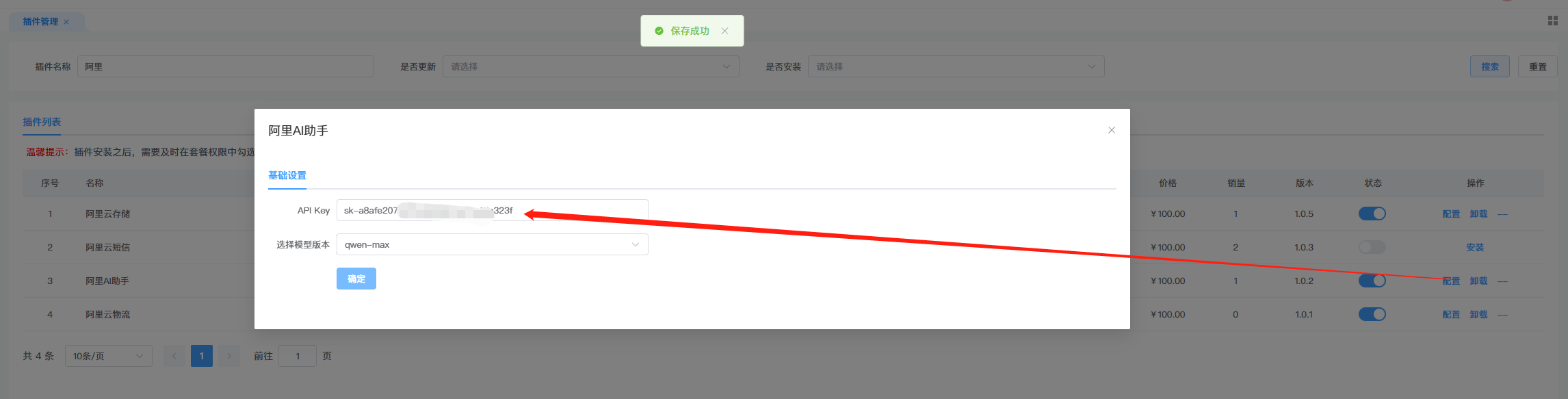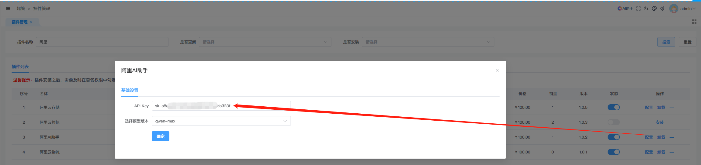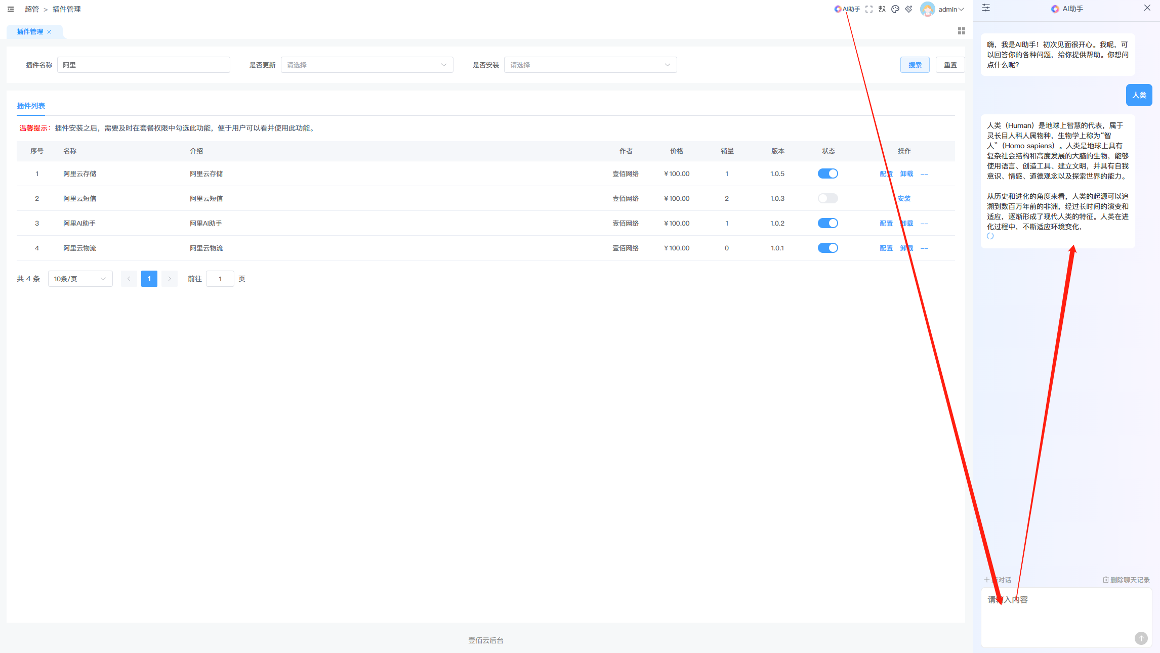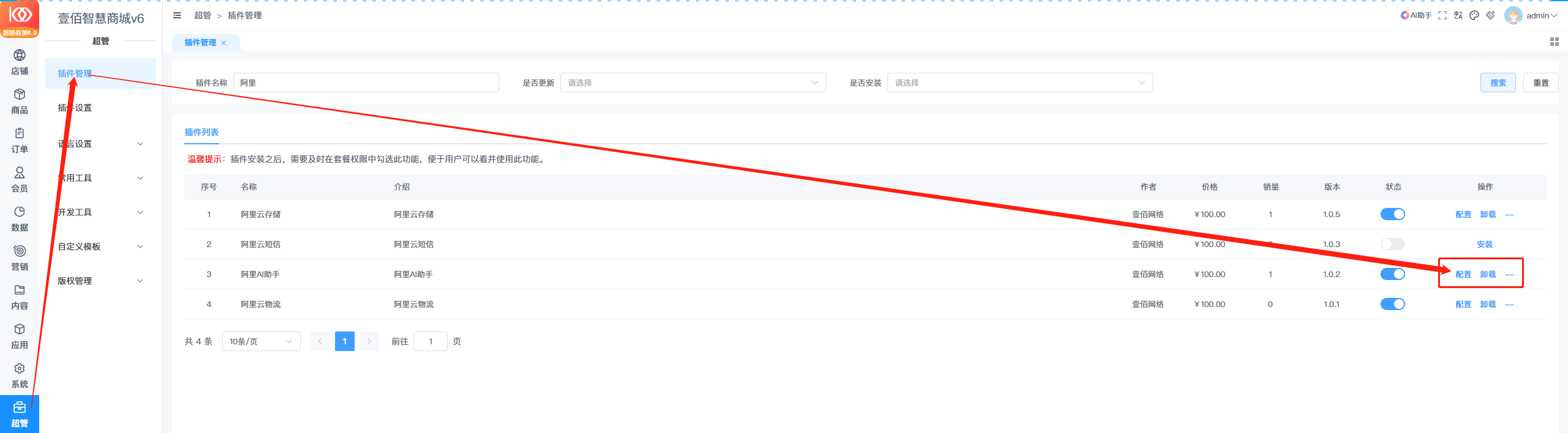 一、在超管菜单下进行【阿里AI助手】插件的安装、更新、配置以及卸载。