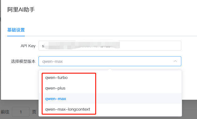 二、配置需要获取 API KEY ,然后选择模型版本。【目前支持版本都在后台展示】