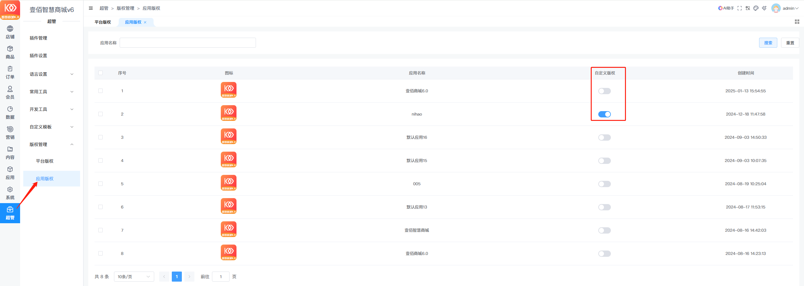 三、超管操作:在超管--版权管理--应用版权菜单下,找到对应的应用,开启自定义版权,该客户则可以单独设置版权展示信息。