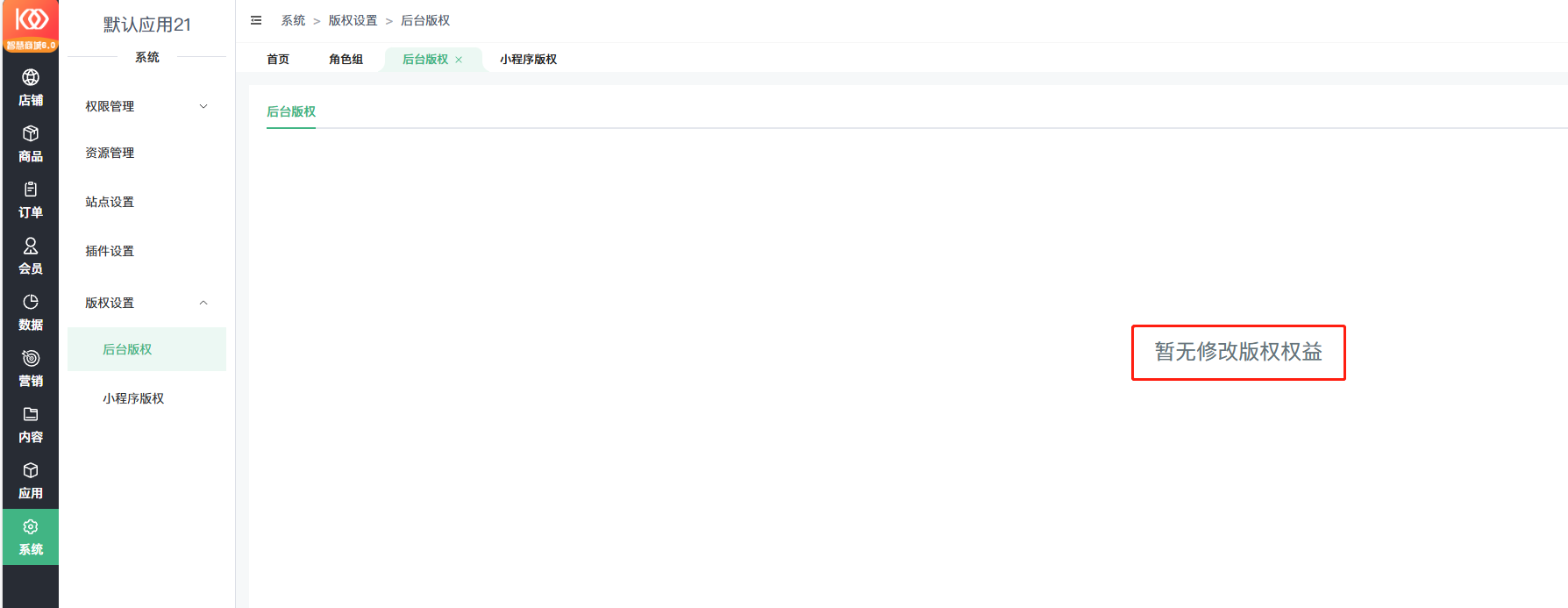 如果说客户账号,点击版权设置提示【暂无修改权益】,原因是因为超管没有开启自定义版权设置。参考第三步处理一下。