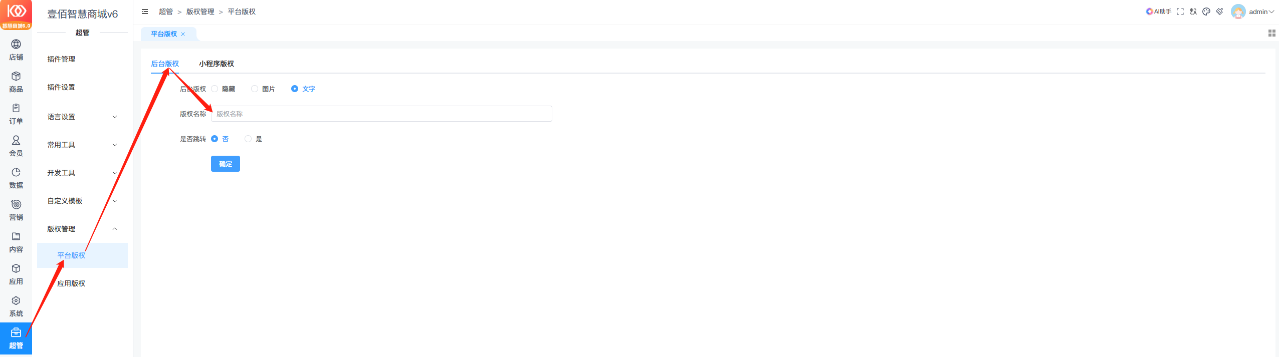 二、超管操作:在应用里面,超管--版权管理--平台版权菜单下,可以设置后台版权和小程序版权。只需要设置一次,所有的应用默认都展示,平台版权这里设置的。