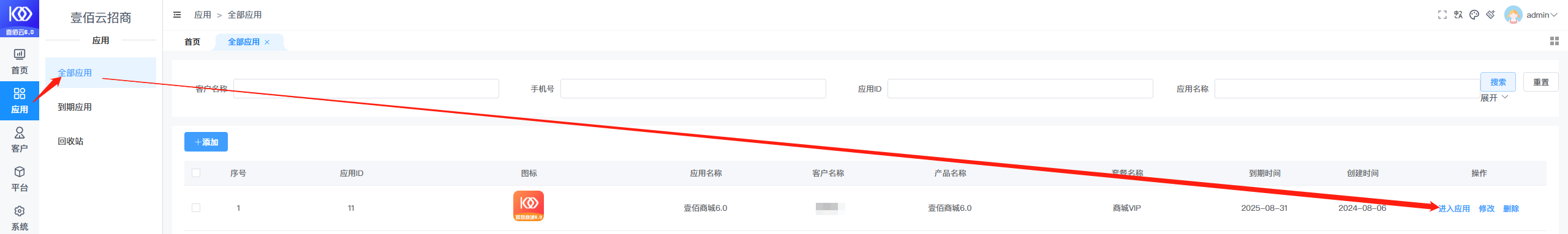 一、超管操作:首先将系统和商城6.0都升级到最新,进入某一个应用里面。