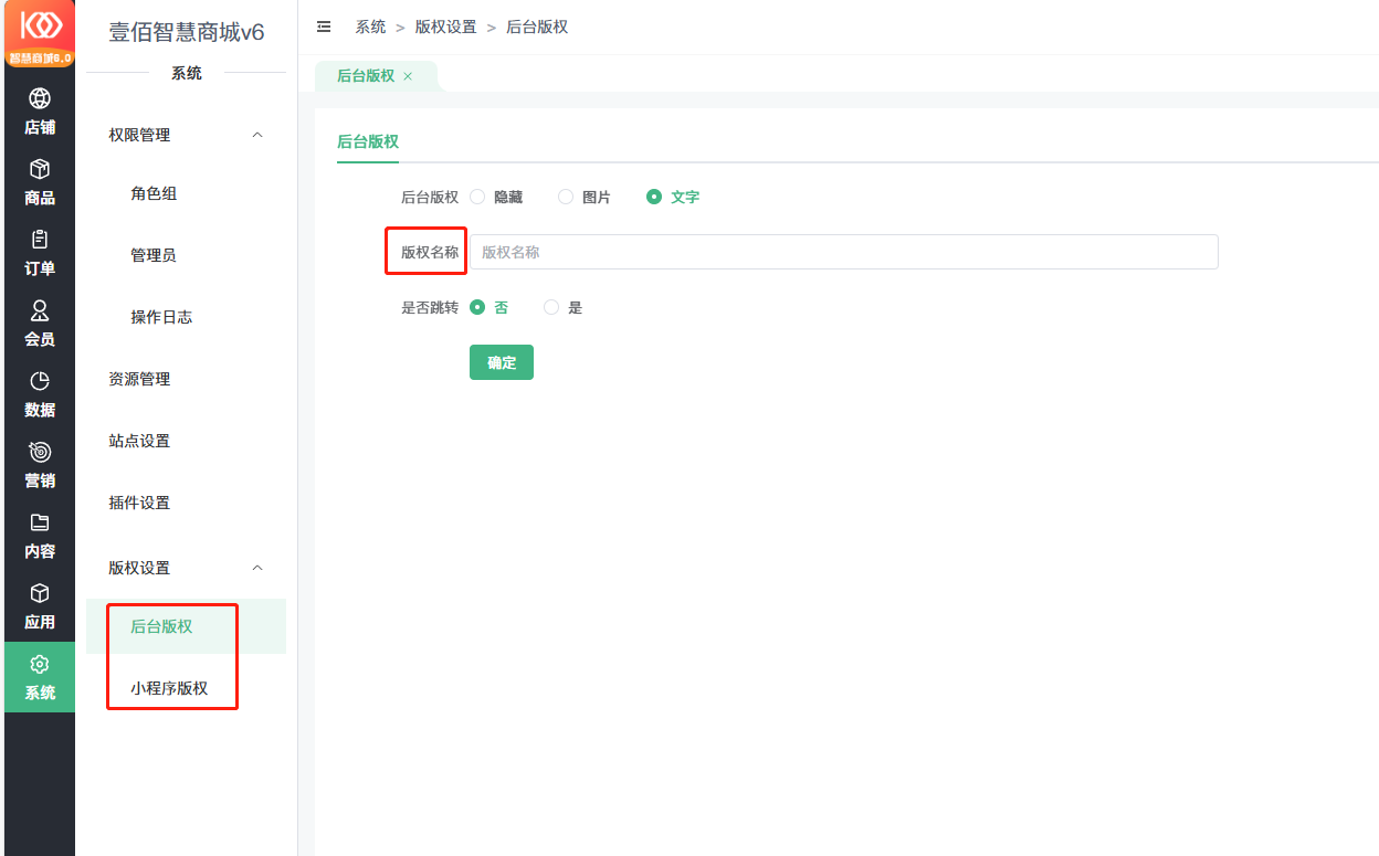 四、客户操作:客户单独设置版权显示,客户登录后台。在系统--版权设置菜单下,可以自定义设置后台和小程序的版权信息