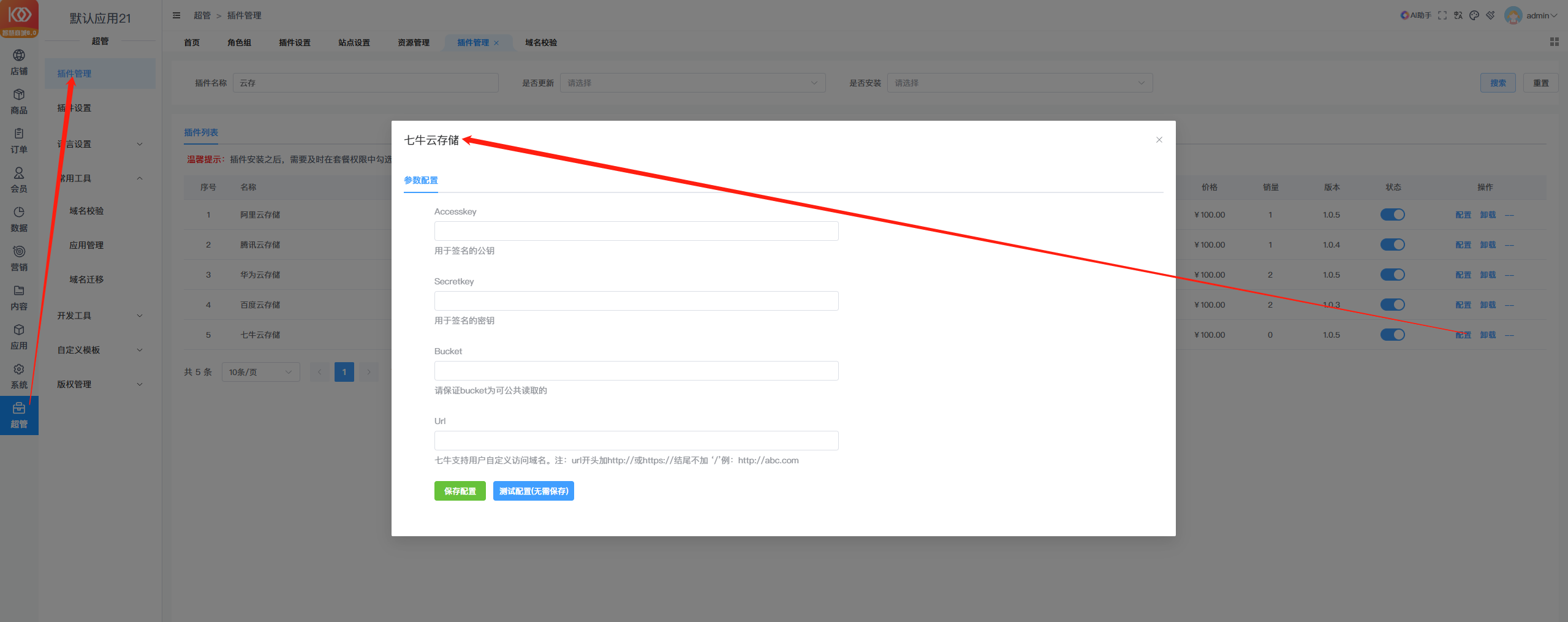 三、登录商城6.0后台,超管--插件管理,选择【七牛云存储】,打开【配置】页面,然后将AK和SK信息复制到对应的位置,然后填写空间名称和空间绑定的域名