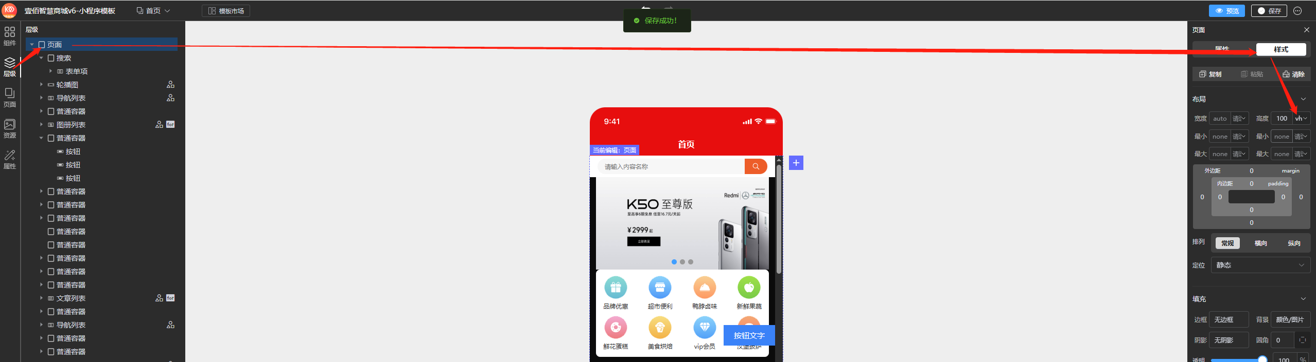 一、进入站点设计页面,找到搜索组件所在页面,【层级--页面】---【样式】 设置页面高度是100vh