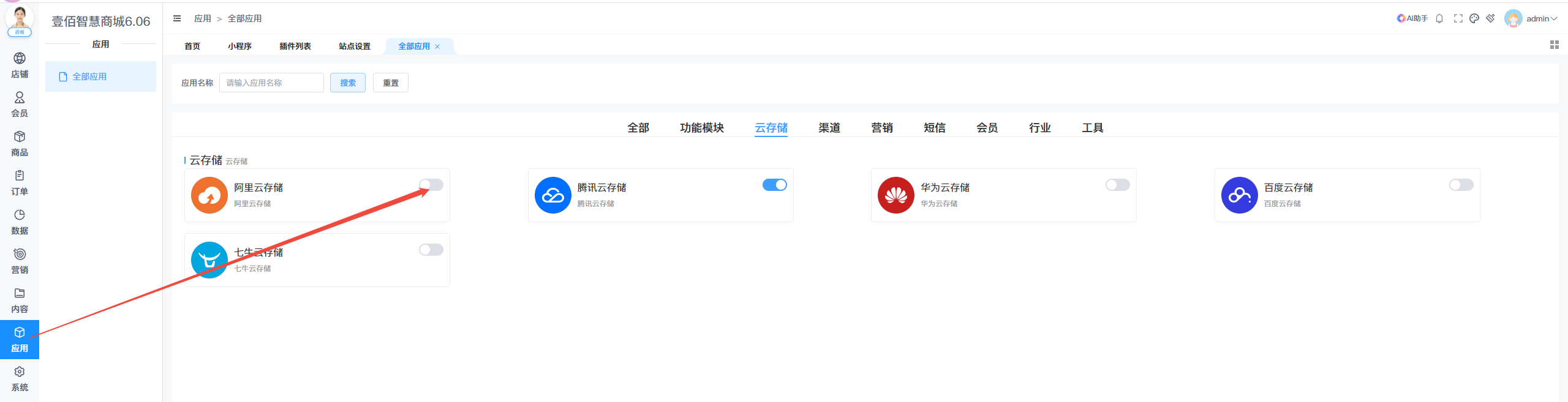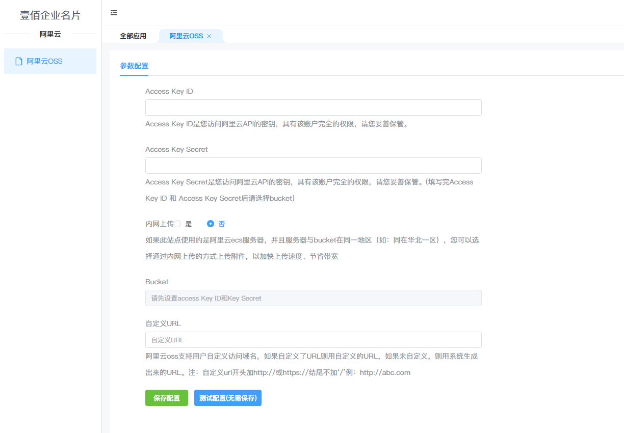 在后台-应用---云存储 找到对应的存储,开启按钮,并进入配置,填写OSS相关的key ID和KEY Secret,选择Bucket,以及配置好的域名