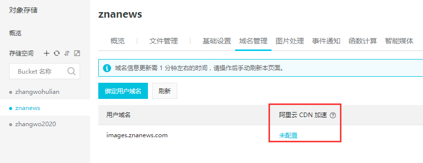 四、选择刚创建的Bucket,点击对应的“域名管理”,绑定用户域名