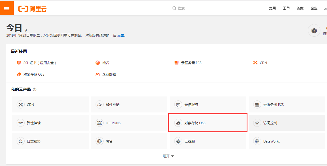 一、登录阿里云账号,进入控制面板,打开“对象存储OSS”