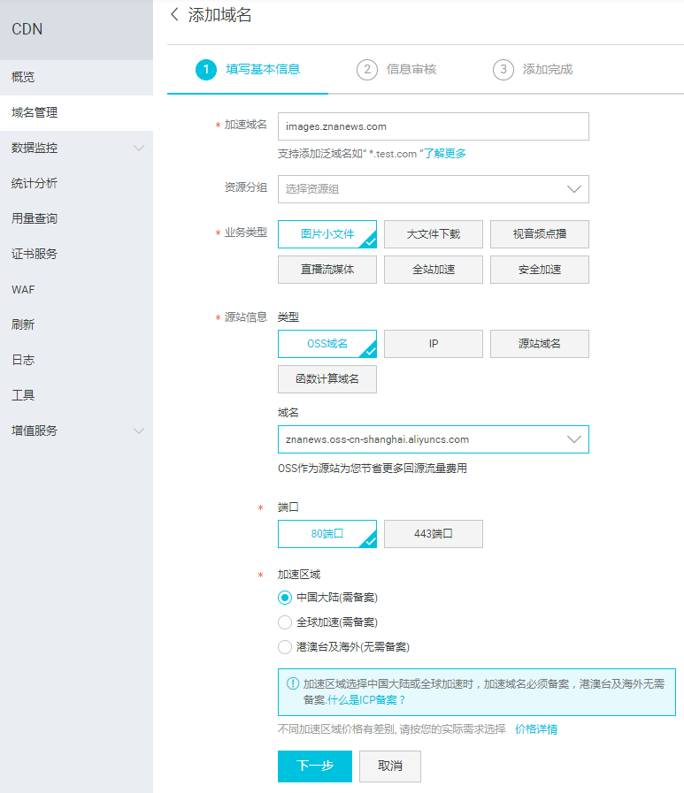 七、添加CDN加速域名页面所有信息默认即可,直接下一步提交