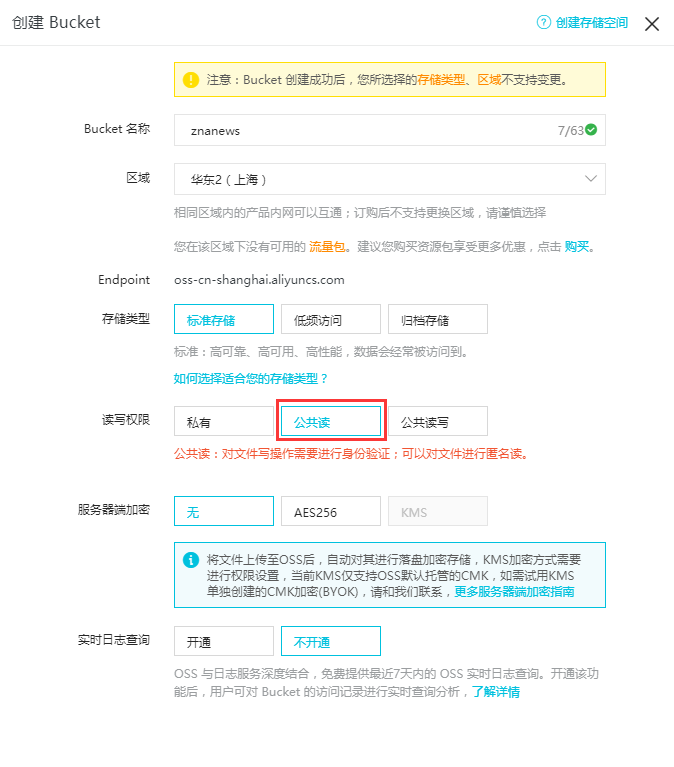 三、填写Bucket名称,读写权限那里选择“公共读”,区域选择跟服务器同一区域,其他默认,然后“确定”提交