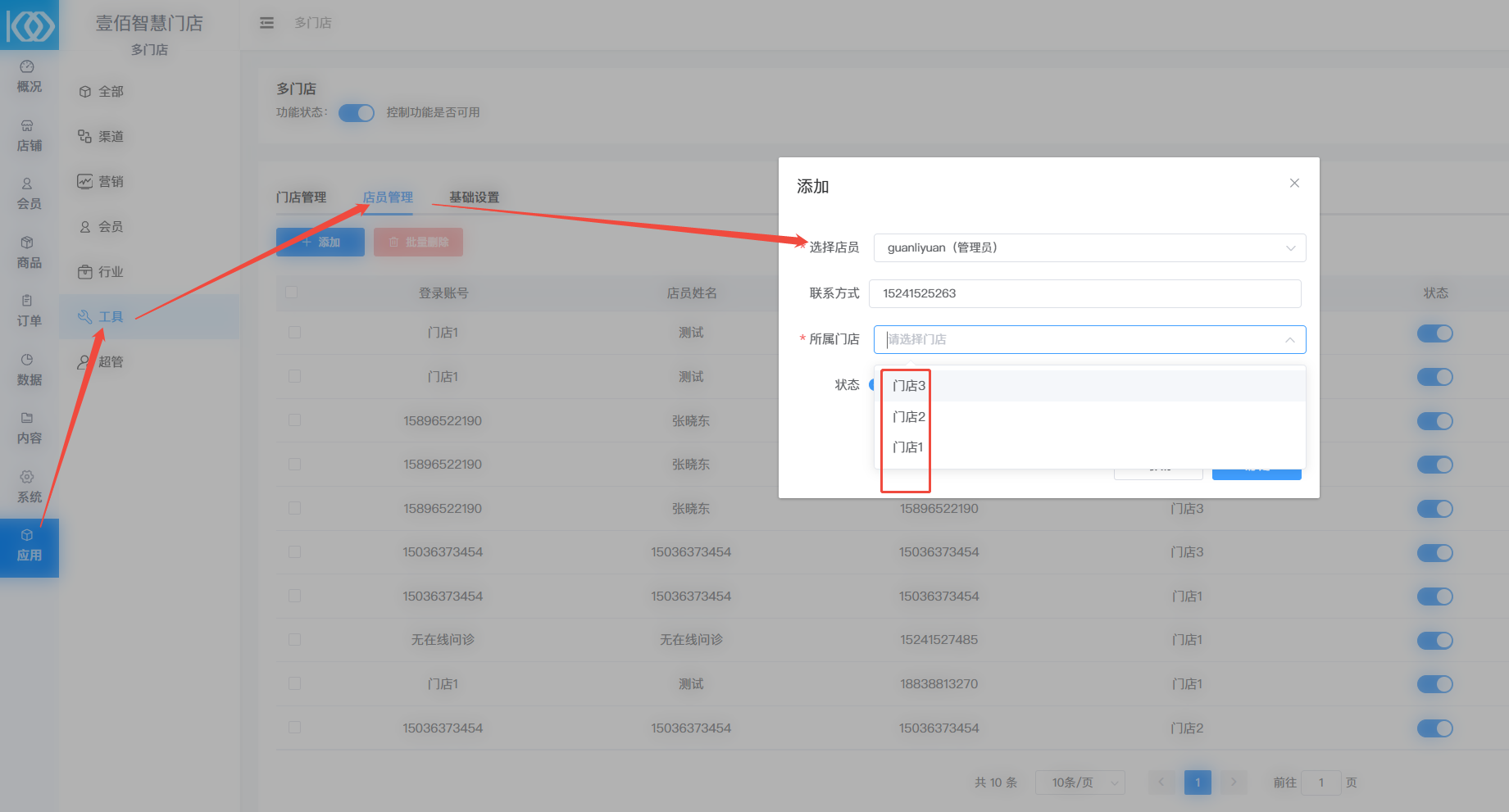 选择店员,绑定管理门店【同一个店员可以绑定多个门店。如果想管理所有门店 那就绑定所有的门店】
