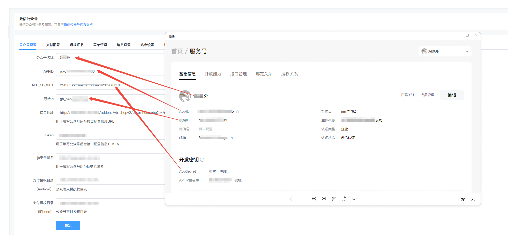 四、复制微信开发者平台--服务号--基础信息页面,公众号名称、 公众号APPID和原始ID 、公众号密钥 APP_SECRET 粘贴到 填写门店后台公众号配置页面的信息,保存。【如下图所示】
