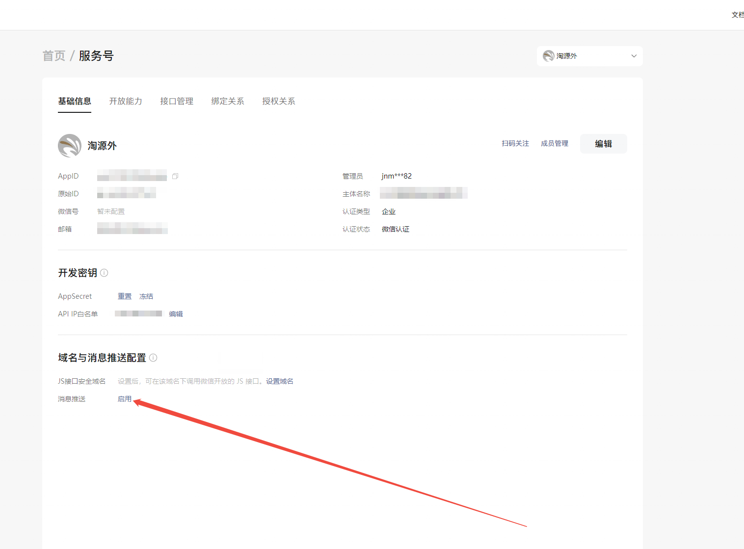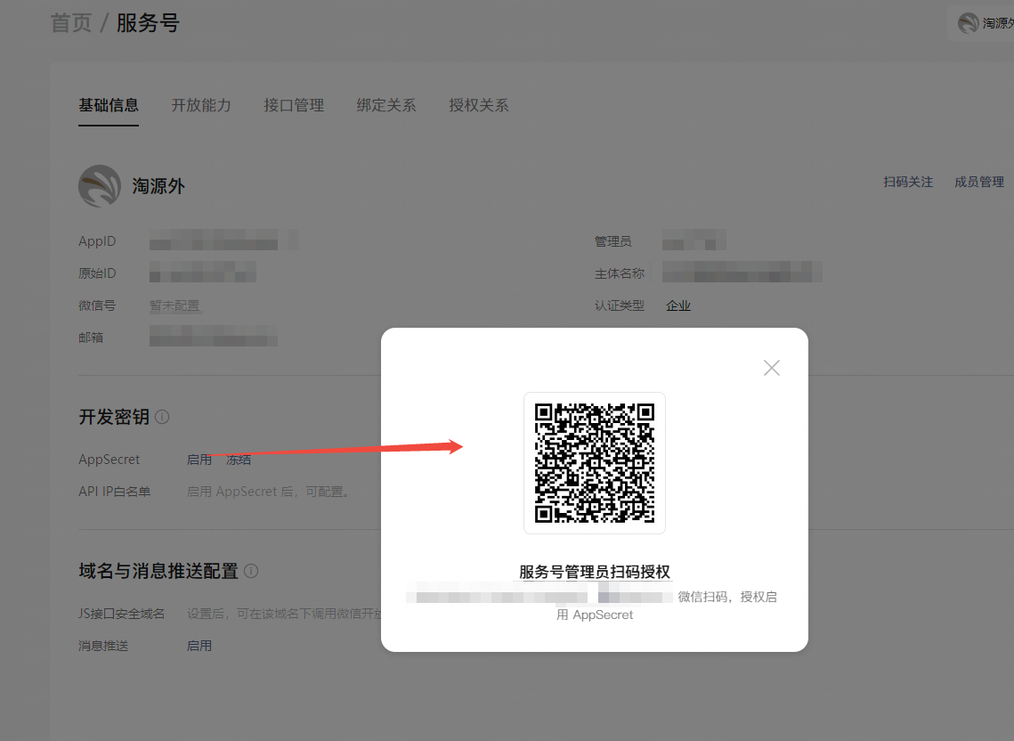 初次配置,点击启用公众号密钥 APP_SECRET【需要公众号管理员扫码】;如果之前密钥已经设置过了,可以点击重置。【扫码之后可以获取到公众号密钥 APP_SECRET;点击复制密钥。密钥要保存好 只能看一次 丢失的话就需要重置了】