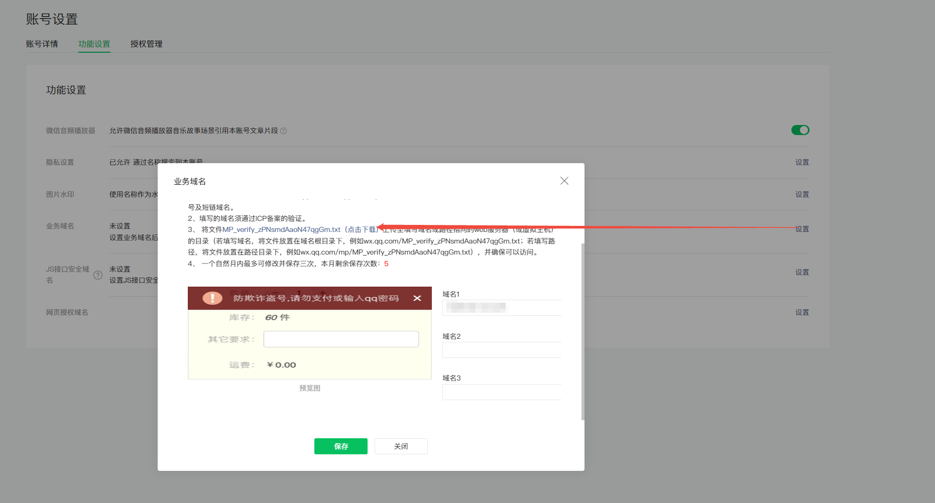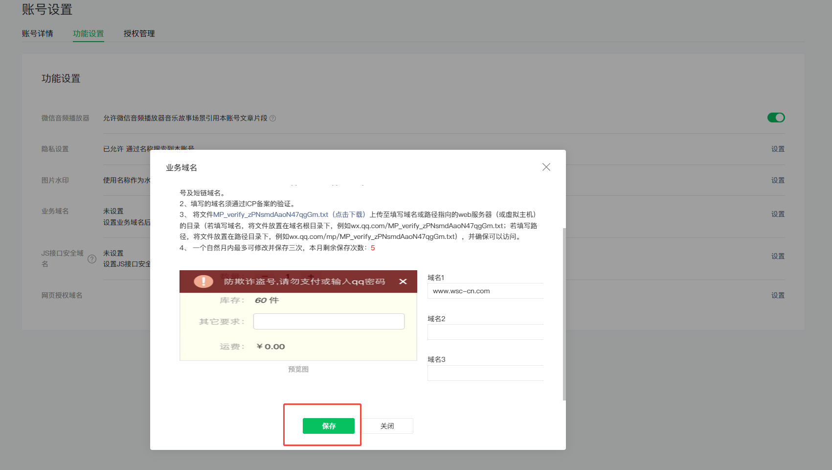 然后返回公众号后台点击保存,依次三个域名都填写一下【效验文件只需上传一次即可】。