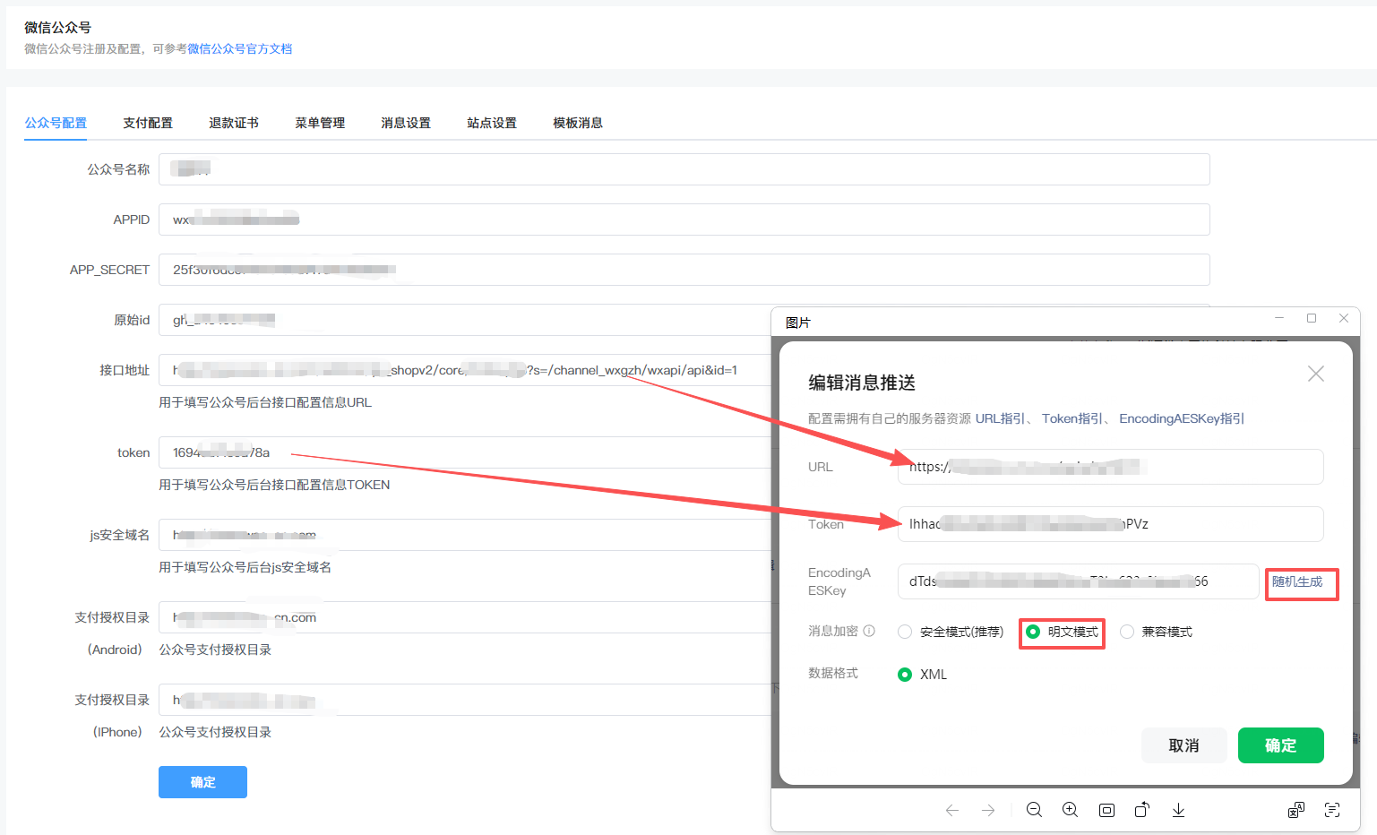 复制门店应用后台服务器地址URL和token 粘贴到 消息推送窗口;EncodingAESKey点击随机生成即可,消息加密选择【明文模式】