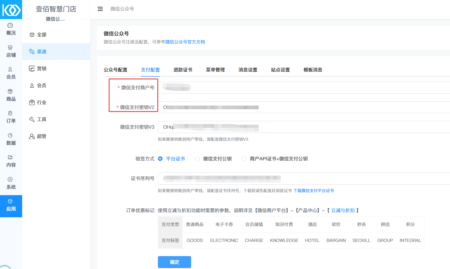 七、打开门店V2后台的【支付设置】页面,填写微信支付商户号和支付密钥,保存即可。