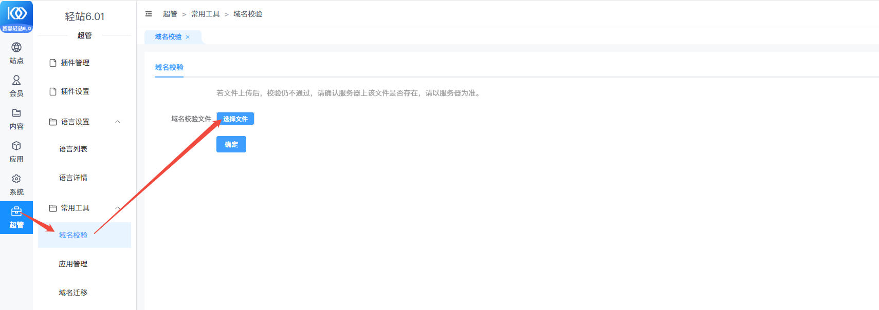 返回后台将下载的效验文件生成到后台 【超管--常用工具--域名效验】选择文件上传点击确定。