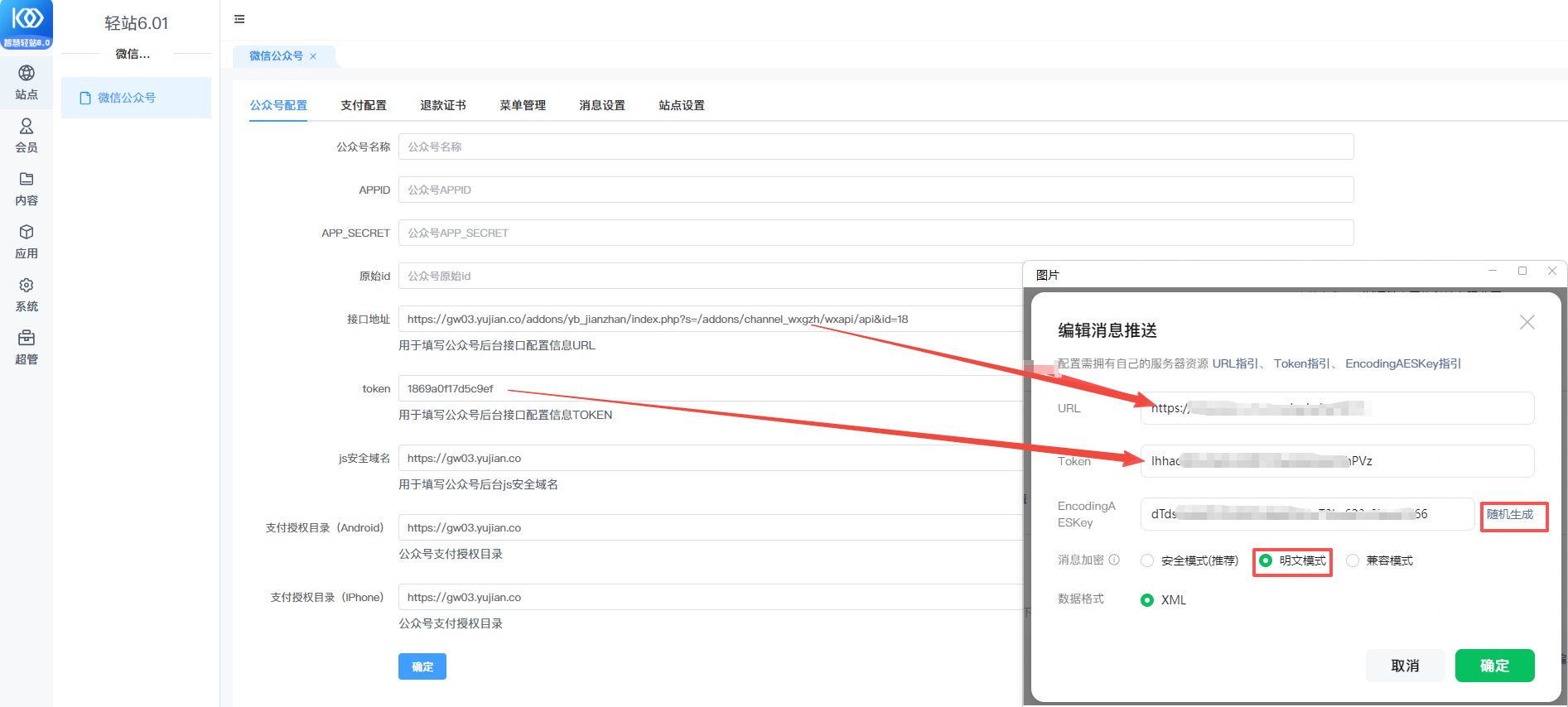 复制门店应用后台服务器地址URL和token 粘贴到 消息推送窗口;EncodingAESKey点击随机生成即可,消息加密选择【明文模式】