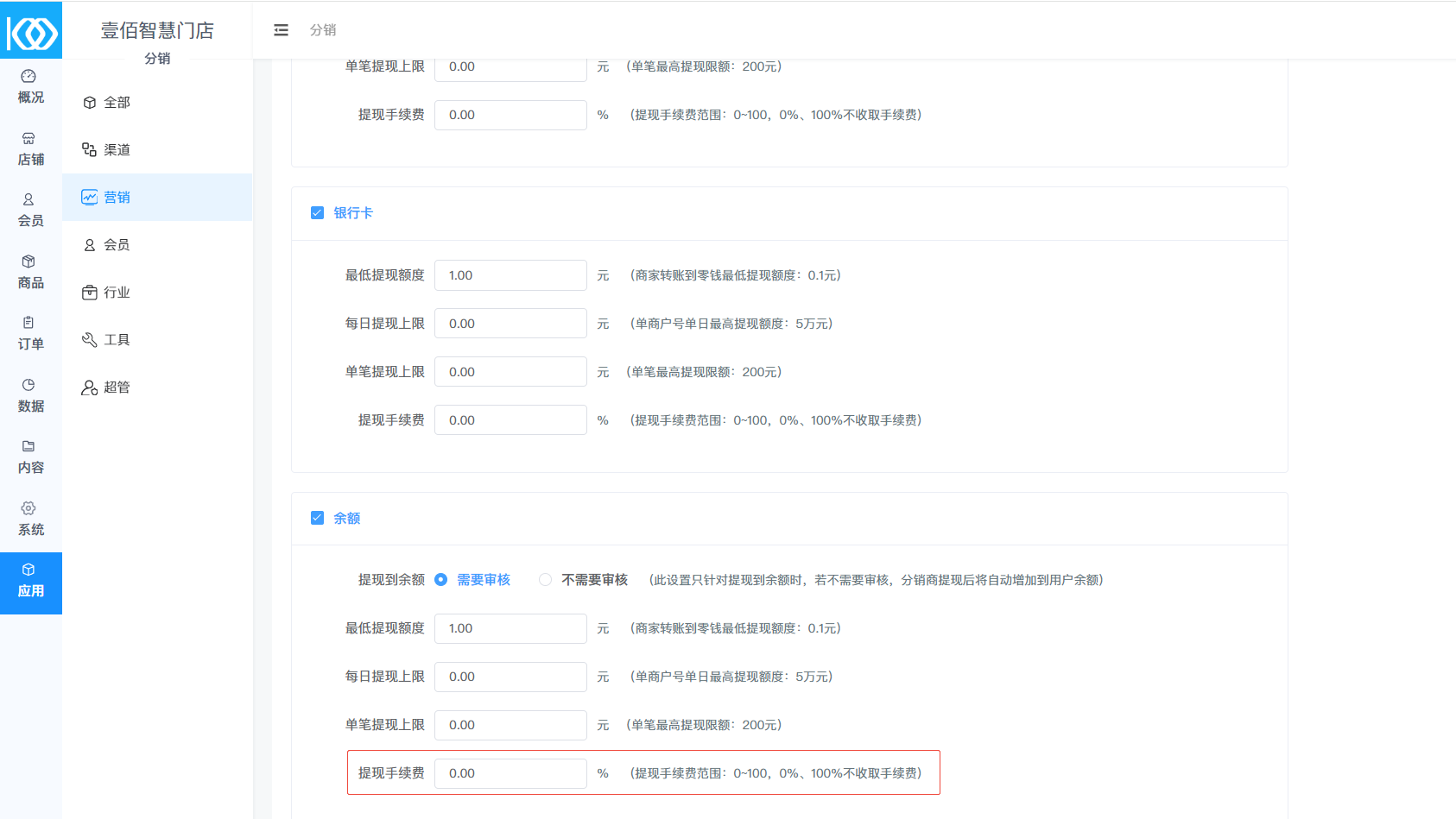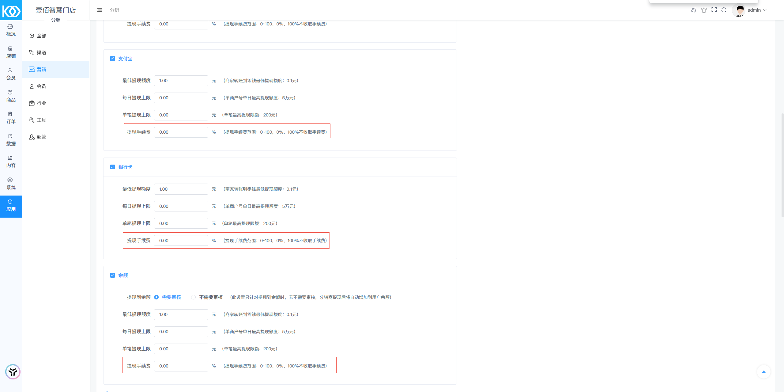 一、分销佣金提现,用户选择提现到余额,可以单独设置余额的手续费【分销提现,增加可以设置不同提现方式手续费(微信、支付宝、余额、银行卡)】