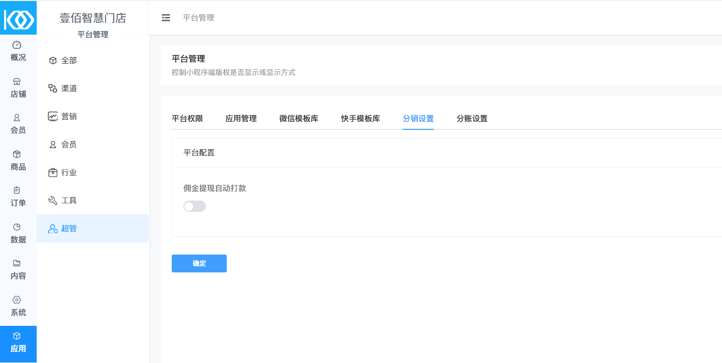 超管登录后台,【应用--超管--平台管理】,分销设置菜单下,开启按钮,自动操作打款。【仅针对余额提现】