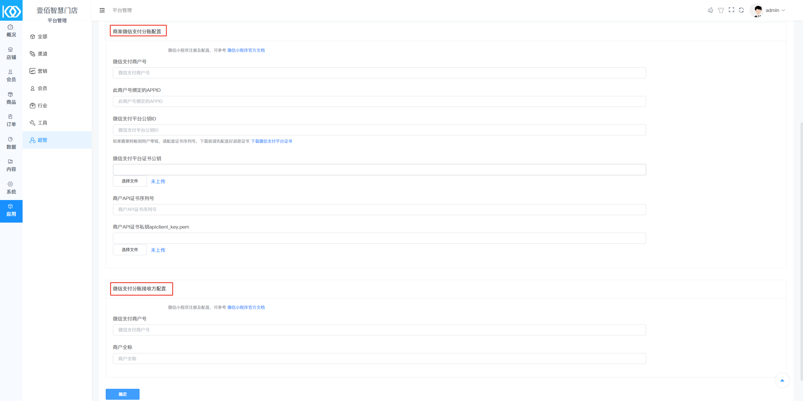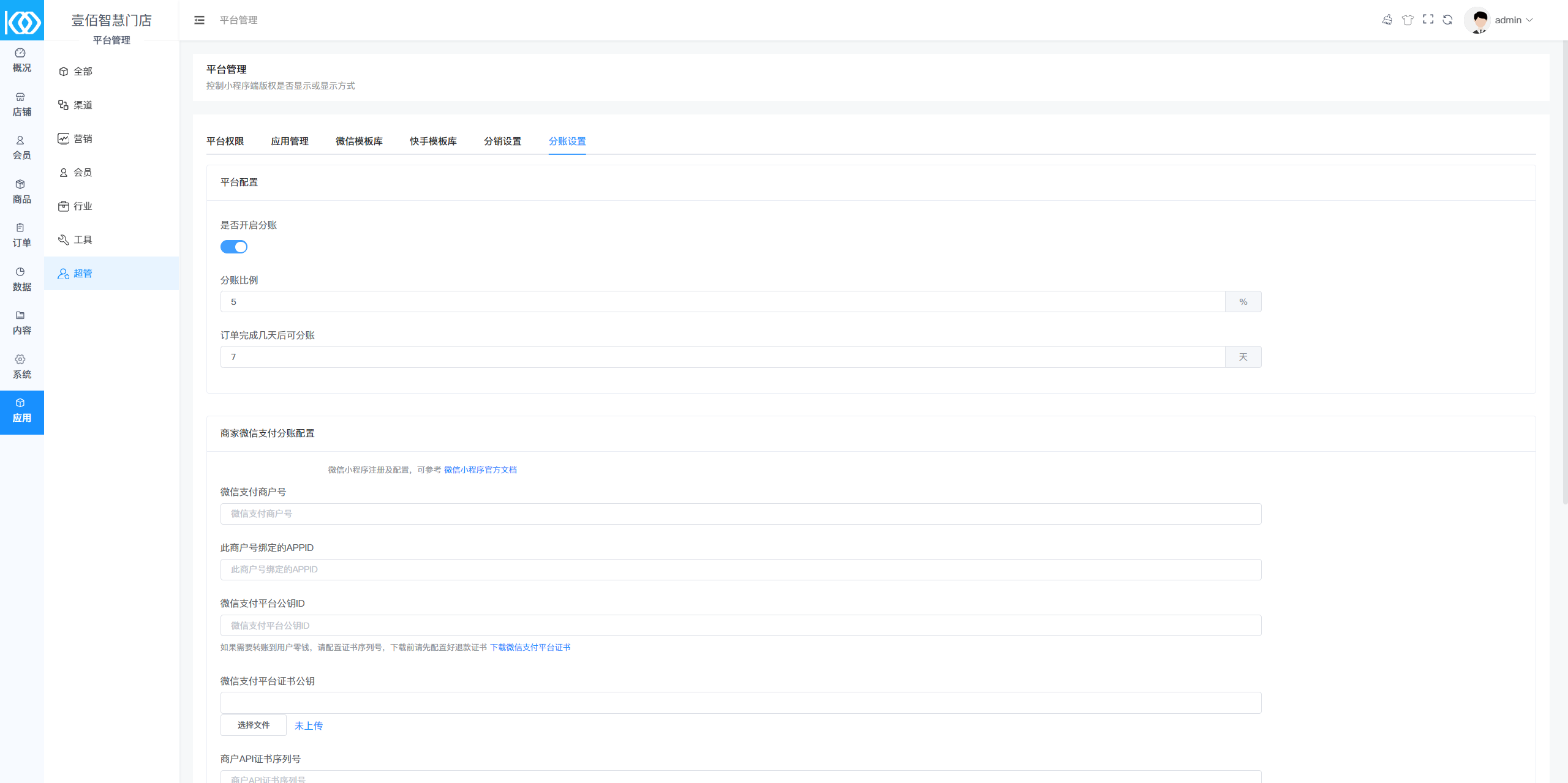 超管登录后台,【应用--超管--平台管理】,【分账设置】菜单下,开启分账按钮,设置分账比例和多久分账;分账这里是指:订单完成确认收款后几天可分账【确认收款需用户手机端操作收款】