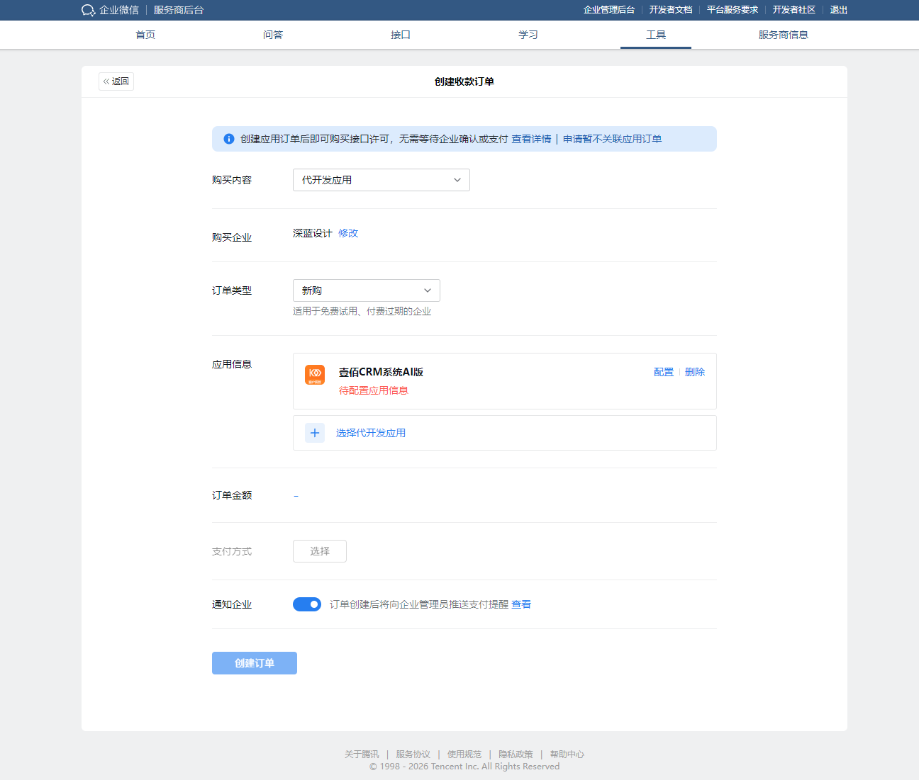 4. (可选)通知企业:保持 【通知企业】 开关开启,订单创建后系统会向该企业的管理员发送支付提醒。