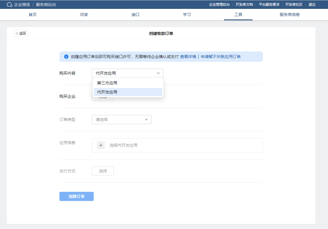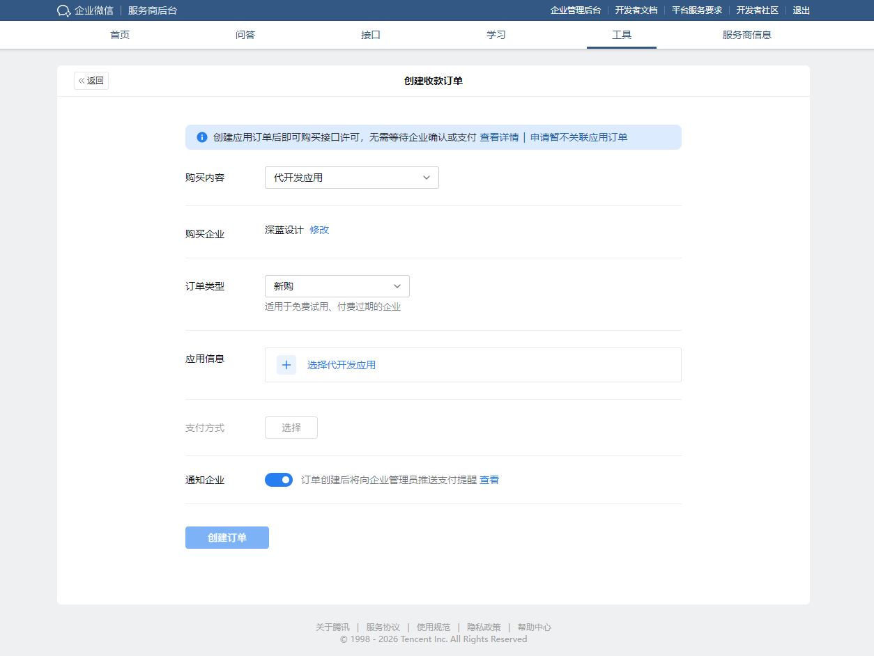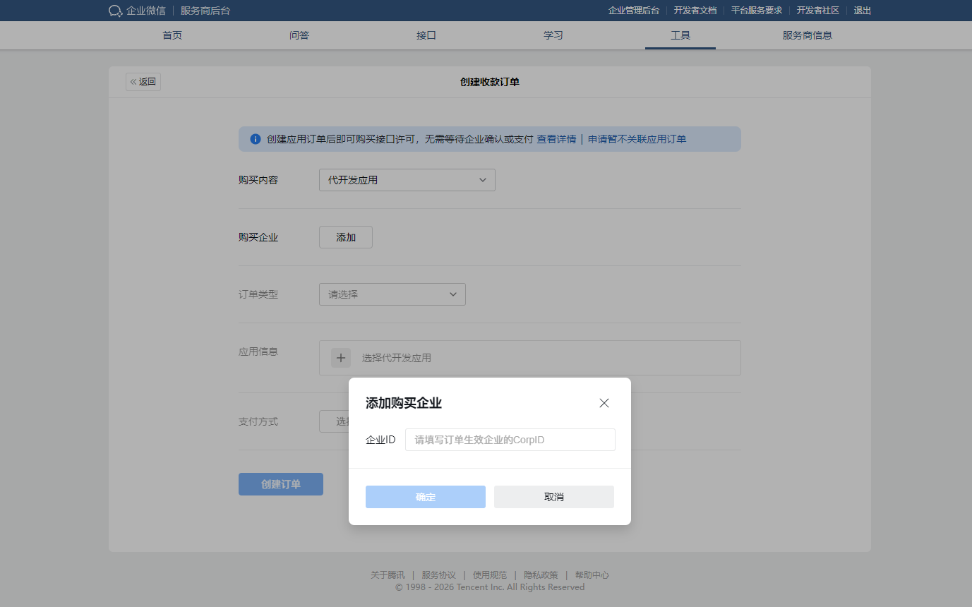 请按照以下步骤,登录企业微信服务商后台,为您的客户创建订单。