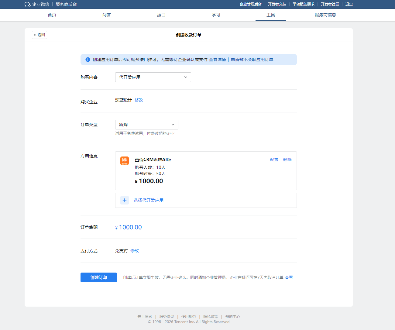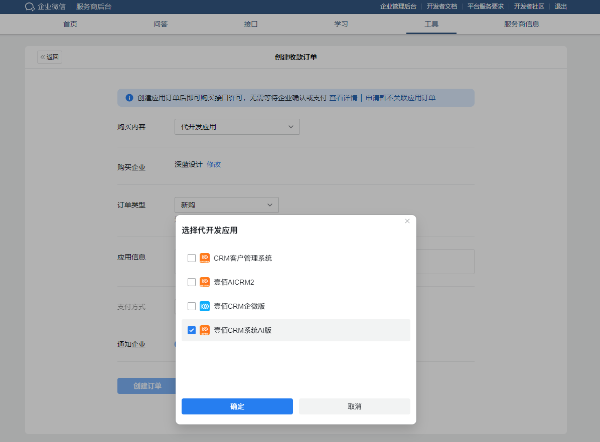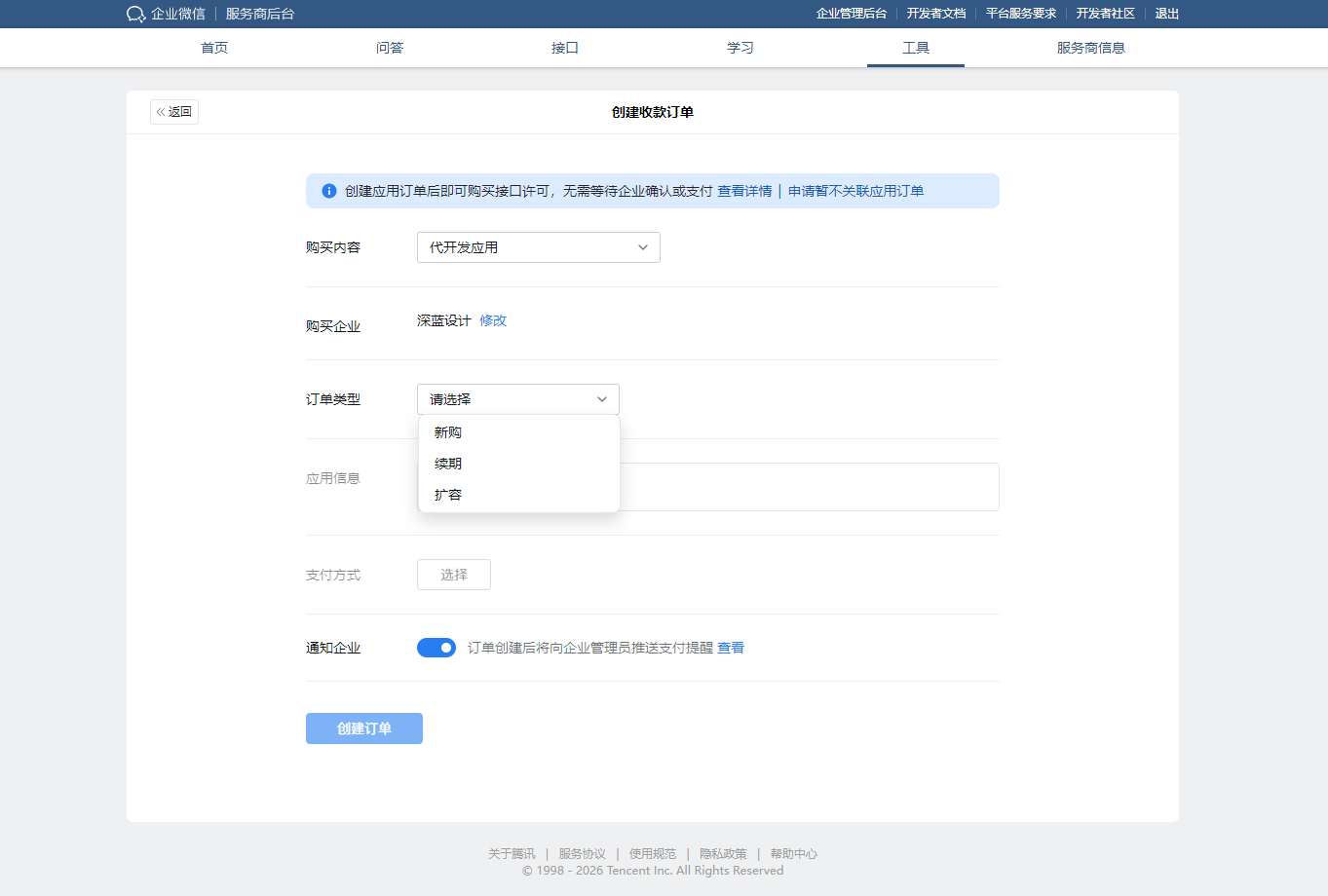 请按照以下步骤,登录企业微信服务商后台,为您的客户创建订单。