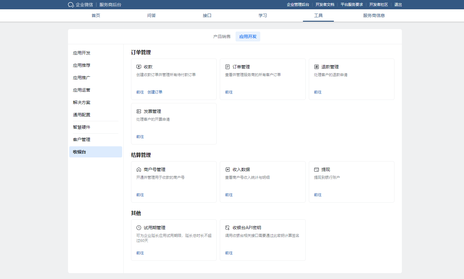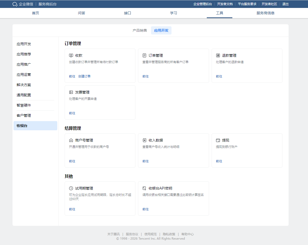 4. 进入“应用开发”页面后,在下方找到 【收银台】 模块,点击其中的 【订单管理】。