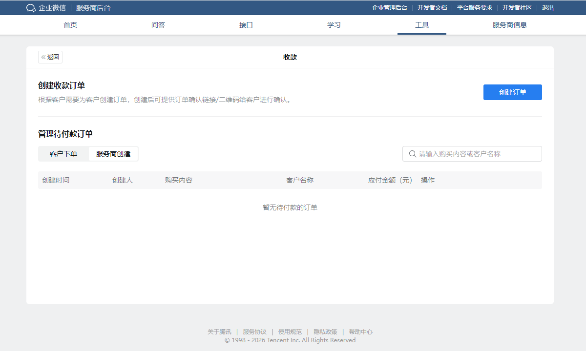 5. 在订单管理页面,点击 【前往】 按钮。进入收款界面,可查看服务商创建的所有订单,也可以点击【创建订单】。