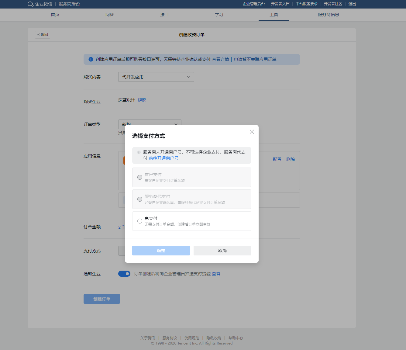3. 选择支付方式:在“支付方式”中,选择一个付款渠道。您可以选择 “服务商代支付” 先行为客户垫付,或选择 “免支付” 创建一个零元订单直接生效(若适用)。