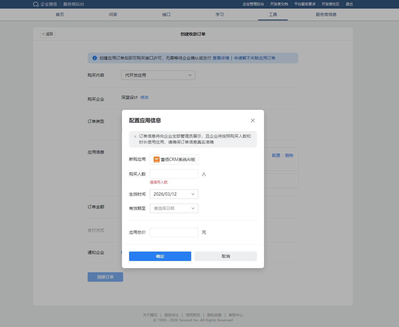 2. 配置详情:点击选择应用右侧的 【配置】 按钮。在弹出的配置窗口中,填写该应用的 购买人数、生效时间 和 有效期至 等关键信息,系统会自动计算订单金额。