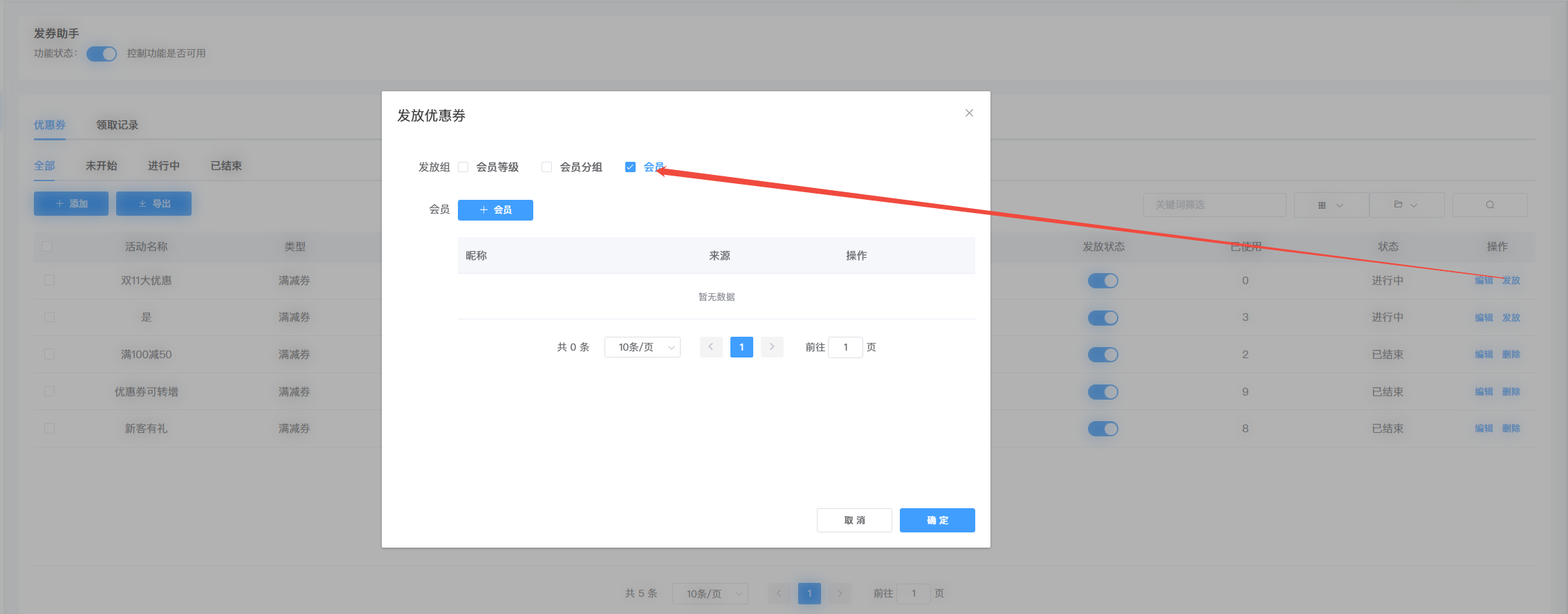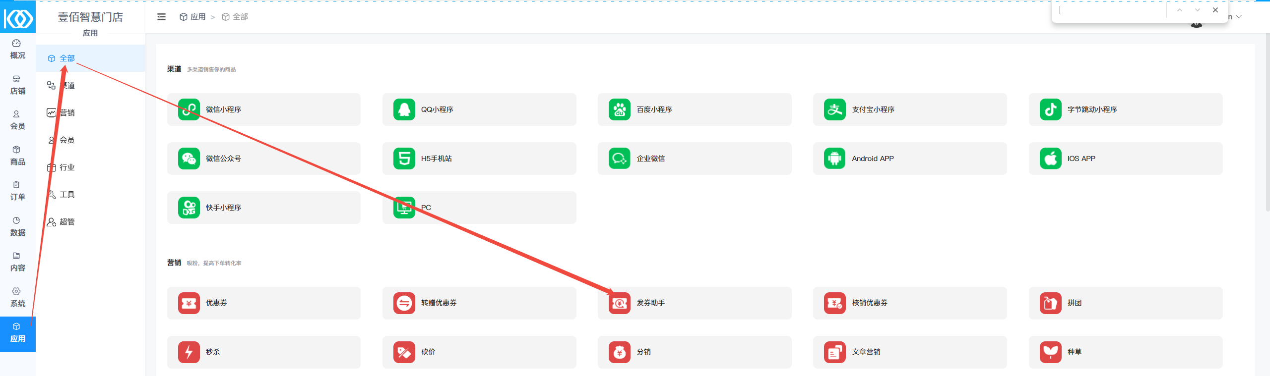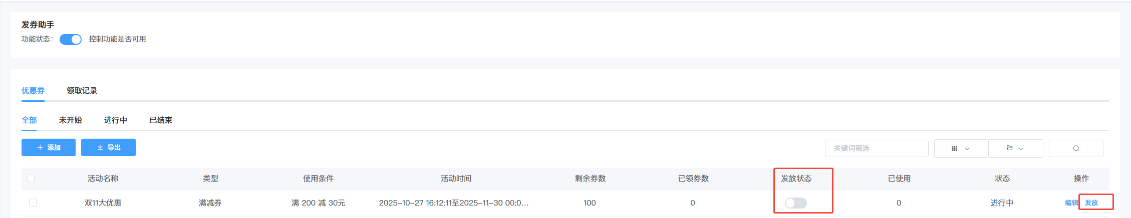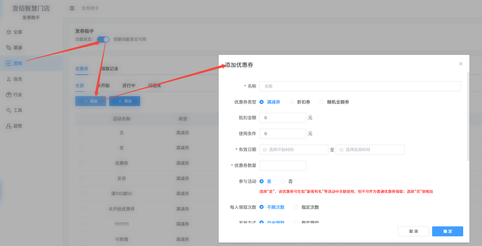 发券助手的使用流程:一、应用--营销--发券助手,开启功能,添加优惠券